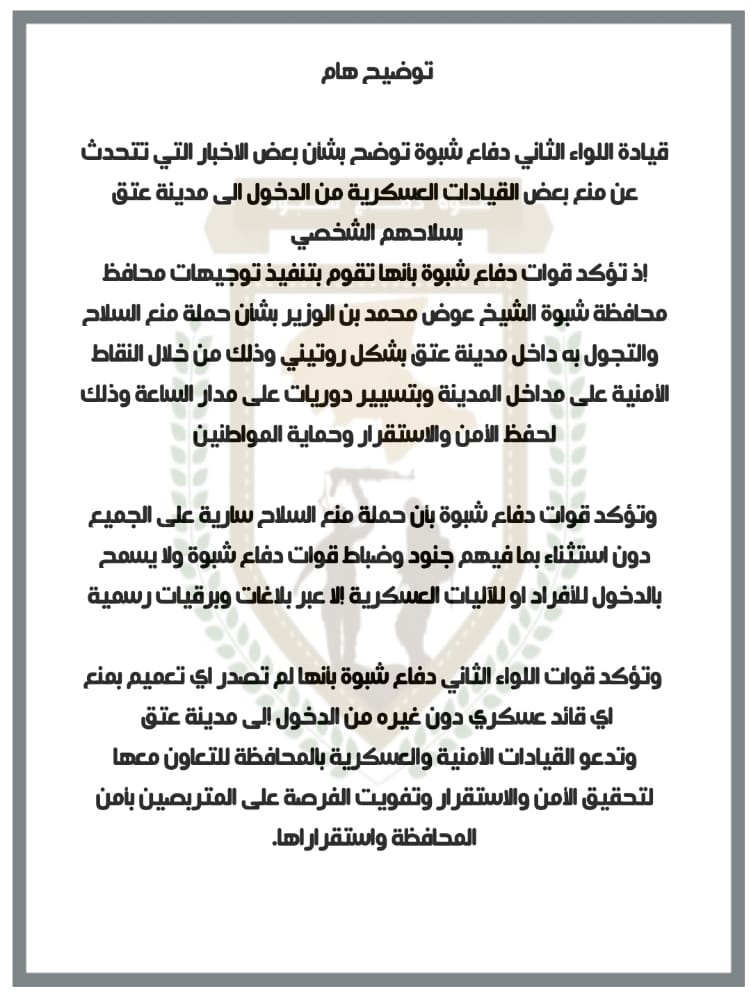 أصدرت قيادة اللواء الثاني دفاع شبوة المكلفة بتأمين عاصمة محافظة شبوة “عتق”، توضيح بشأن شائعات تحدث عن منعها لقيادات عسكرية من الدخول مدينة عتق بسلاحهم الشخصي.