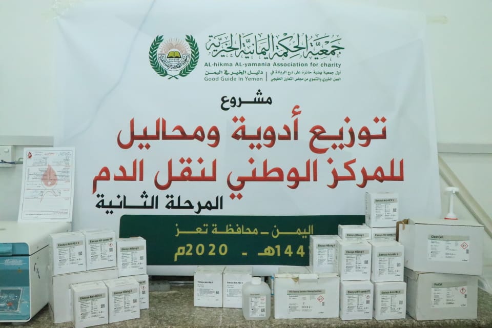 يمن اونلاين سلمت جمعية الحكمة اليمانية الخيرية المركز الوطني لنقل الدم بمستشفى الثورة في تعز محاليل الطبية للفحوصات الفيروسيه بتكلفة بلغت 5300 دولار امريكي وذلك في اطار المرحلة الثانية لدعم المركز............