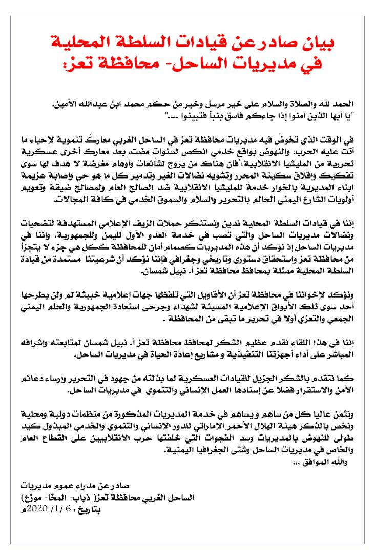 الحمد لله والصلاة والسلام على خير مرسل وخير من حكم محمد ابن عبدالله الأمين. "يا أيها الذين آمنوا إذا جاءكم فاسق بنبأ فتبينوا ...."في الوقت الذي تخوضُ فيه مديريات محافظة تعز في الساحل الغربي معاركَ تنموية لإحياء