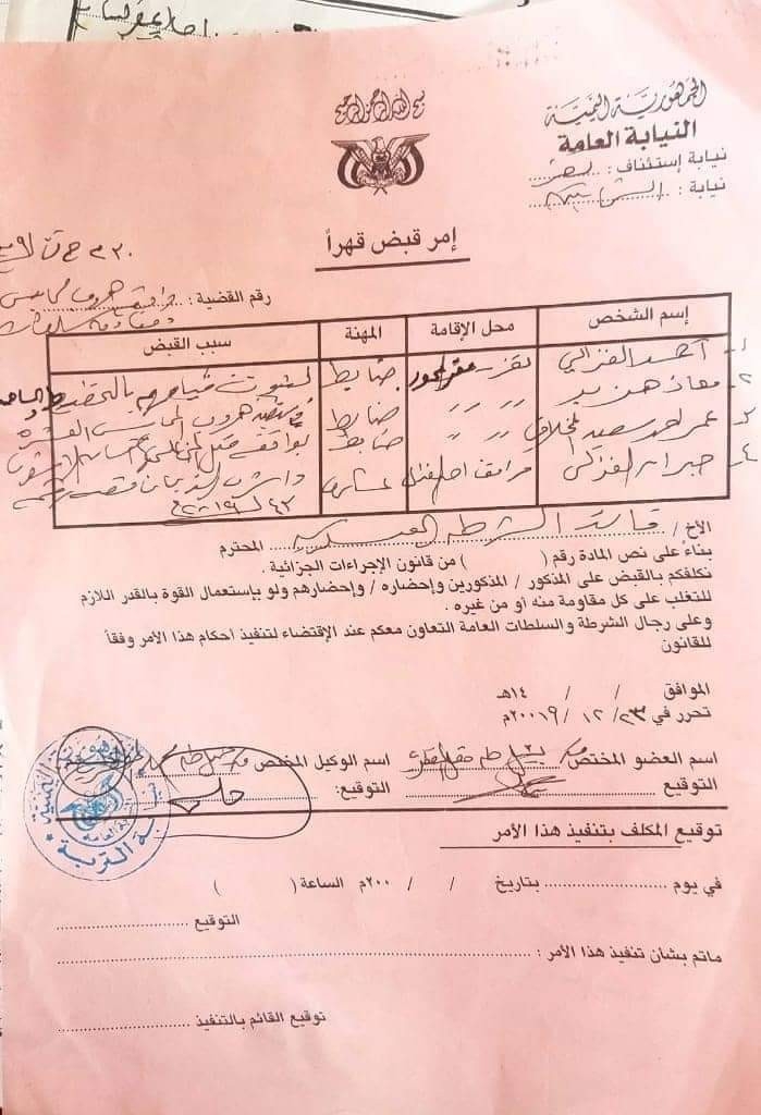 أصدرت النيابة العامة أمر قبض قهري بحق ضباط عسكريين في محور تعز، لثبوت تورطهم في التخطيط والمساهمة في تنفيذ هروب المساجين العشرة المتهمين بقتل مرافقي محافظ تعز، من سجن التربة، يوم الأحد.