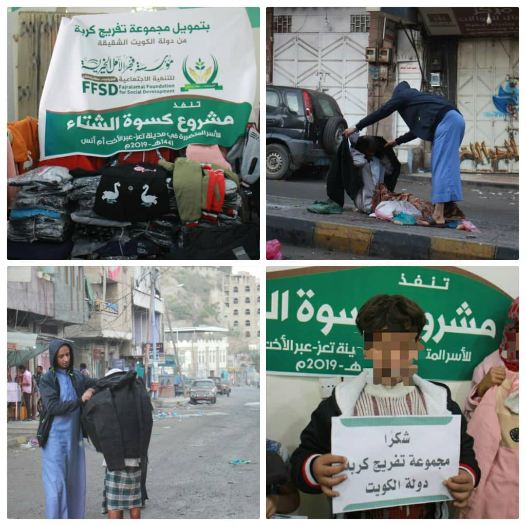 يمن اونلاين _ تعز بتمويل كريم من مجموعة تفريج كربه من دولة الكويت الشقيقة بواسطة الأخت الكريمة أم أنس اختتمت مؤسسة فجر الأمل الخيرية للتنمية الاجتماعية مشروع دفئ الشتاء المرحلة الأولى والتي تم فيها استهداف 170