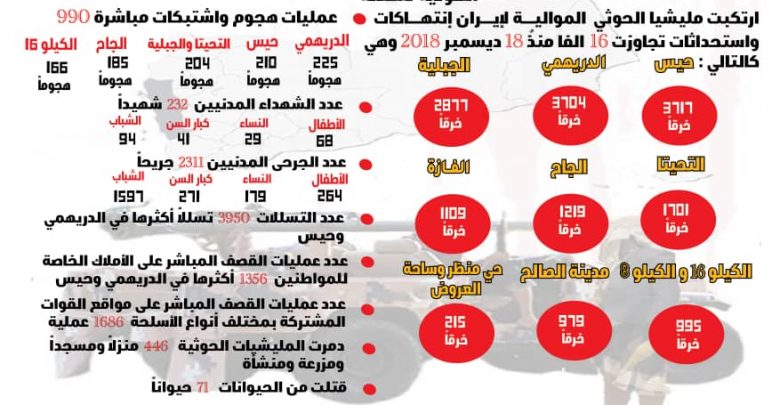 خلال عام من انطلاق الهدنة الأممية التي تتضمن وقف إطلاق النار والعمليات العسكرية في الحديدة ، ارتكبت المليشيات الحوثية ذراع إيران في اليمن أكثر من ( 16 ألفاً ) من الخروقات والإنتهاكات العسكرية والإنسانية .