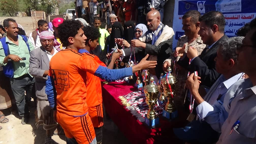 يمن اونلاين - تعزكرم مدير مديرية المسراخ يحيى إسماعيل وممثل الصندوق الإجتماعي للتنمية فرع تعز عبدالحكيم جامل وضابط مشروع برنامج الاستجابة المجتمعية آمال الشميري فريق المطالي للبراعم الذي فاز على نظيره فريق بلعان