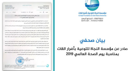 يمن أونلاين دعت مؤسسة النجاة للتوعية بأضرار القات في اليوم العالمي للطفل 20 نوفمبر 2019، الحكومة اليمنية والجهات المختصة لسنّ قانون يمنع تعاطي الأطفال دون سن 18 عاماً للقات، وأكدت على ضرورة تفعيل المادة السابعة من