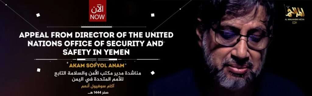 ناشد مسؤول الأمن والسلامة التابع لمكتب الأمم المتحدة آكم سوفيول أنعم، المختطف لدى التنظيم الإرهابي منذ فبراير الماضي، لإطلاق سراحه، في مقطع فيديو مصور، نشره فرع تنظيم القاعدة في اليمن.جاء ذلك