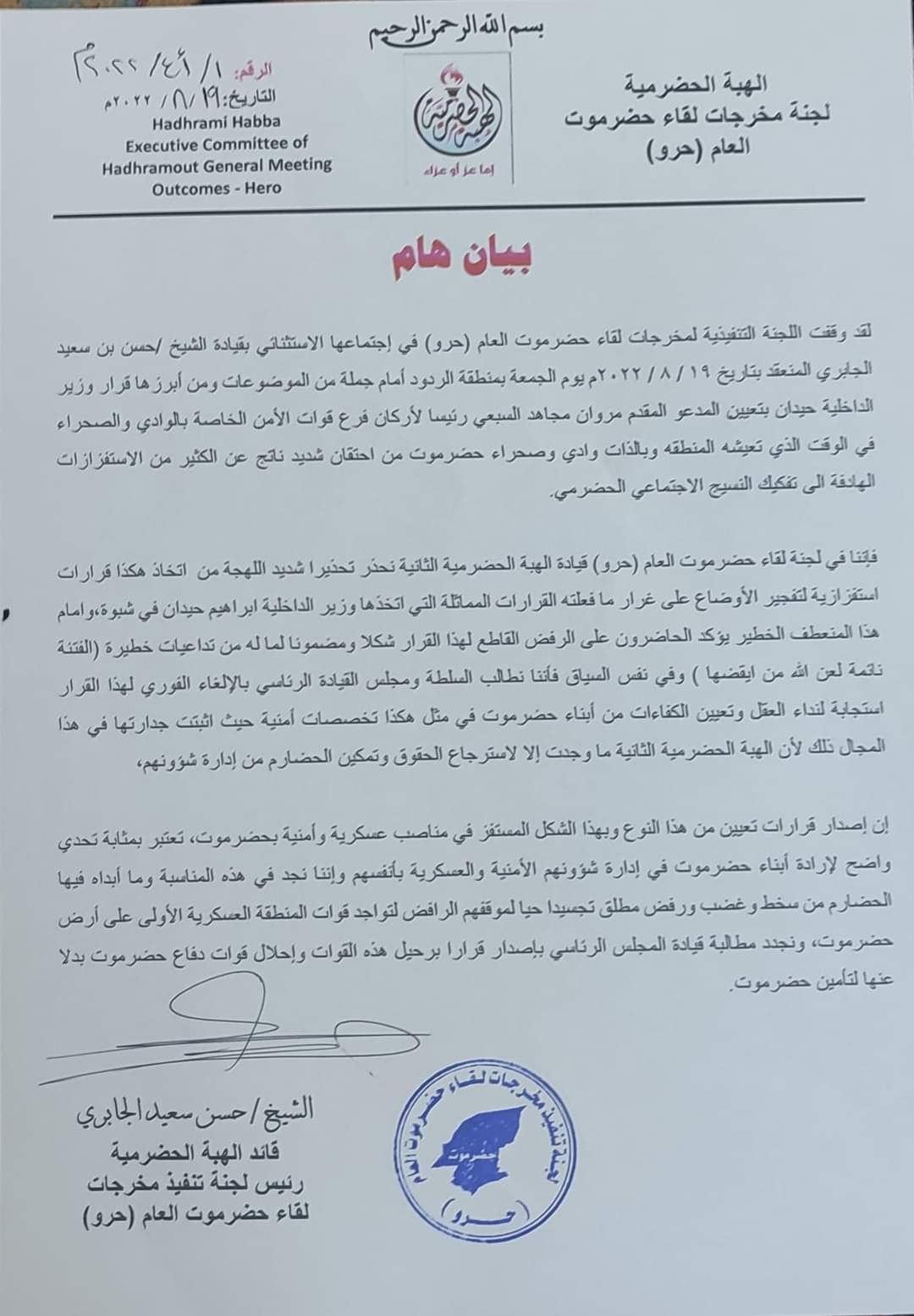 أصدرت قيادة الهبة الحضرمية، قبل قليل بيان هام وذلك حول قرار وزير الداخلية بتعيين شخصية من محافظة مأرب في القوات الخاصة بحضرموت.