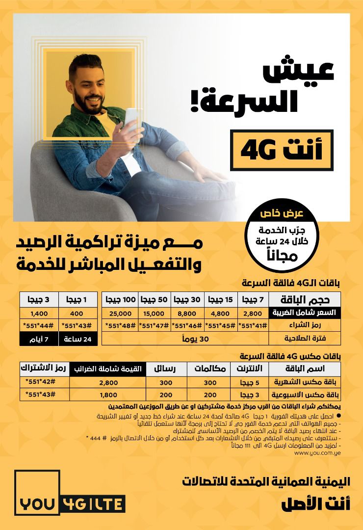كشفت الشركة اليمنية العمانية YOU للاتصالات عن اسعار بقات الانترنت بخدمة 4Gونشرت شركة YOU للاتصالات قبل قليل أسعار باقات ال 4G عبر صفحتها الرسمية فيسبوك اسعار الباقات:نص المنشور:كما وعدناولأنك أنت الأصلنضع بين يديك