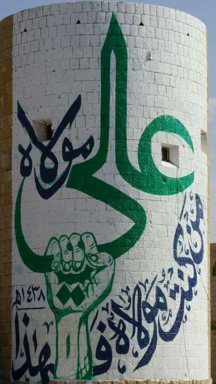 في خطوة استفزازية بادر الحوثيين إلى استخدام واجهة إحدى نوبات الحراسة الخاصة بالقصر الجمهوري بصنعاء لرسم لوحه جدارية تضمنت عبارات حول حق الولاية .