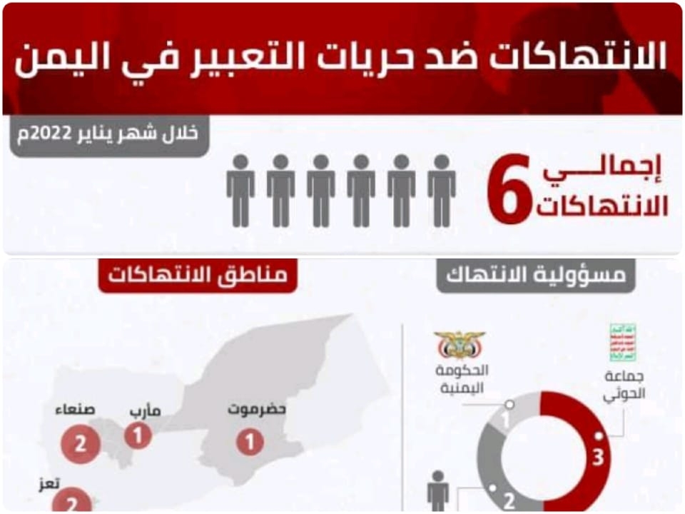 أصدر مرصد الحريات الاعلامية في اليمن تقريرة الشهري ” انفوجرافيك ” حول وضع الحريات الإعلامية ومايتعرض له الصحفيين والمؤسسات الإعلامية من ممارسات تعسفية .