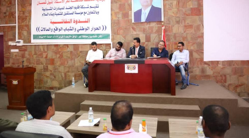نفذت شبكة إقليم الجند للمبادرات الشبابية بالتعاون مع مؤسسة المستقبل للتنمية وبناء السلام، اليوم الثلاثاء ندوة نقاشية حول الحوار الوطني والشباب الواقع والمآلات ، في قاعة ديوان محافظة تعز .