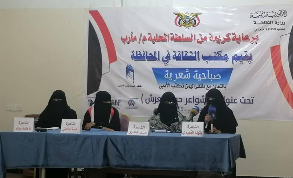 أقام مكتب الثقافة بمحافظة مارب بالتعاون مع ملتقی "اليمن تكتب الأدبي"، صباحية شعرية بعنوان (شواعر حول العرش) لأربع شاعرات ، حضرها عدد من الشعراء والأدباء والمهتمين في المحافظة.