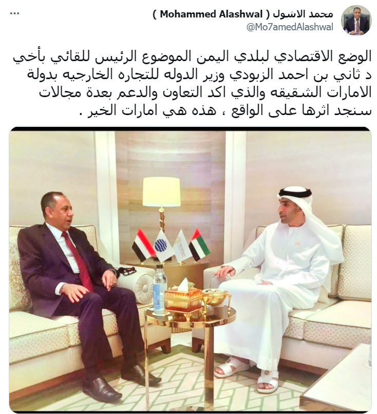 أشاد وزير إصلاحي في حكومة المناصفة اليمنية، بنتائج لقاءه بنظيره الإماراتي على هامش زيارته إلى أبوظبي ضمن وفد رئيس الوزراء الدكتور، معين عبدالملك .وقال وزير الصناعة والتجارة، محمد الأشول في تغريدة له بتويتر،