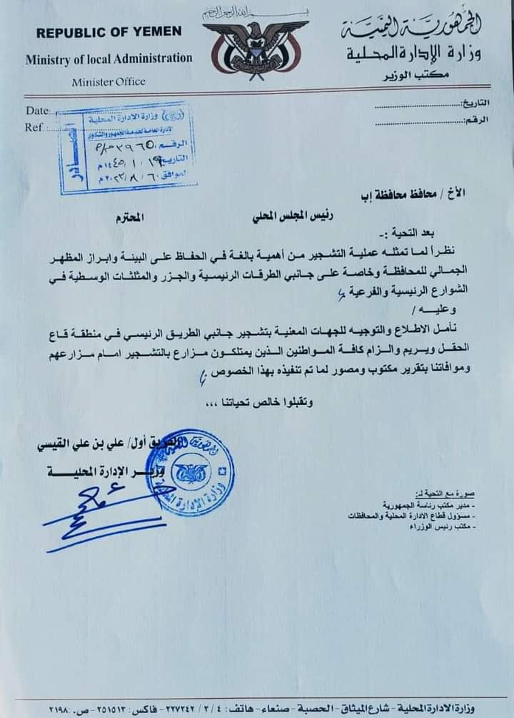 يريم وكتاب وتشجير جانبي الطريق الرئيسي الذي يمر وسطه من (يريم شمالا حتى المدخل الجنوبي لمدينة كتاب ) وطريق (كتاب -السدة ) وتحديد اراض المواطنين الزراعية بالاشجار المثمرة كثيفة الخضرة استغلالا للمياه التي تهدر طوال