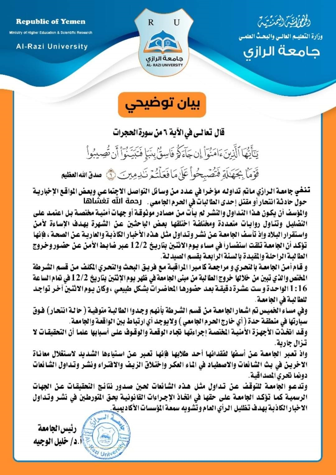 رسمياً.. الاعلام الأمني ينصف جامعة الرازي ويدحض حملة التشهير التي تعرضت لهابفضل إدارتها الناجحة استطاعت أن تفرض نفسها خلال فترة وجيزة واحدة من أفضل الجامعات الخاصة في اليمن، حتى غدت جامعة الرازي وجهة الكثير من