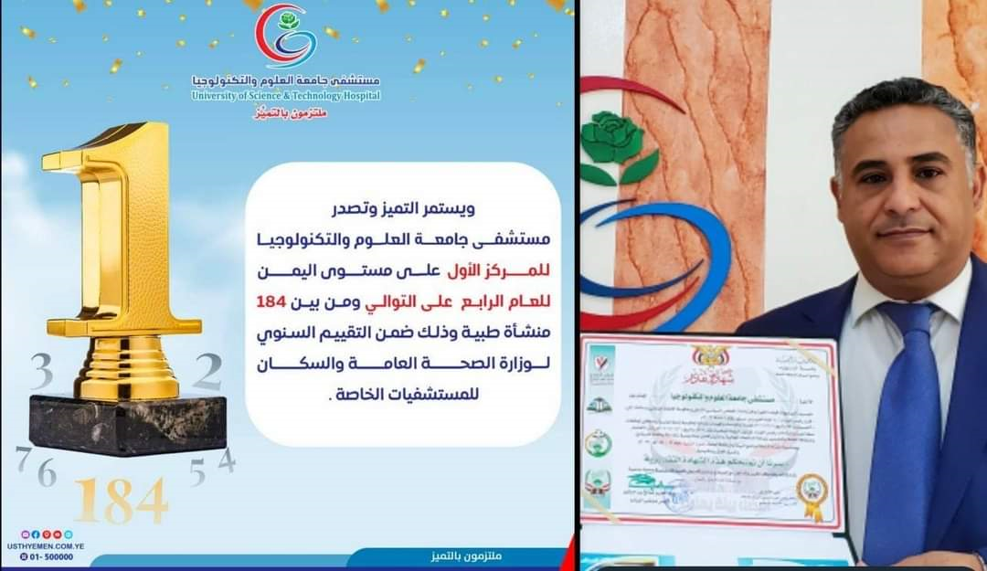 اعلنت وزارة الصحة العامة والسكان نتائج التقييم السنوي للمنشآت الطبية الخاصة في الجمهورية اليمنية لعام 2022م بتصدّر مستشفى جامعة العلوم والتكنولوجيا قائمة المستشفيات اليمنية الخاصة ال 184 بحصوله على المركز الأول