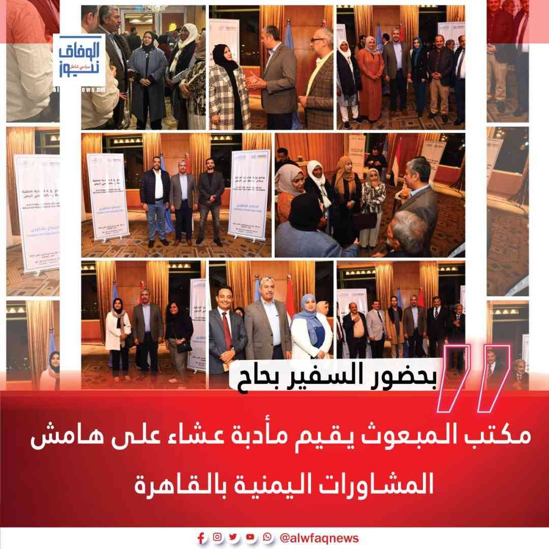 القاهرة _ خاص:بحضور سعادة السفير الدكتور خالد بحاح سفير اليمن في القاهرة، اقام مكتب المبعوث الاممي الى اليمن مأدبة عشاء على هامش جلسات المشاورات التي يقيمها المكتب بالقاهرة لنحو 60مشاركا ومشاركة من اليمنيين من