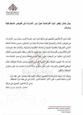 كشف نادي الاعلاميين اليمنيين في تركيا،عن قيام الامارات العربية المتحدة بقرصنت ندوة كان قد أعلن عن تنظيمها عبر منصة الزوم، حول دور الإمارات في تقويض السلام والديموقراطية. وأوضح النادي في بيان حصل "المشهد