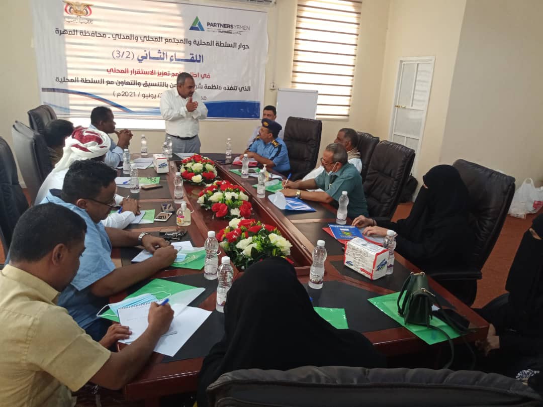 يمن اونلاين -لميس الاصبحي نفذ في مدينة الغيضة اليوم السبت منظمة شركاء اليمن الدولية بالتنسيق والتعاون مع السلطة المحلية بمحافظة المهرة حوار السلطة المحلية والمجتمع المدني، اللقاء الثاني، في اطار برنامج تعزيز