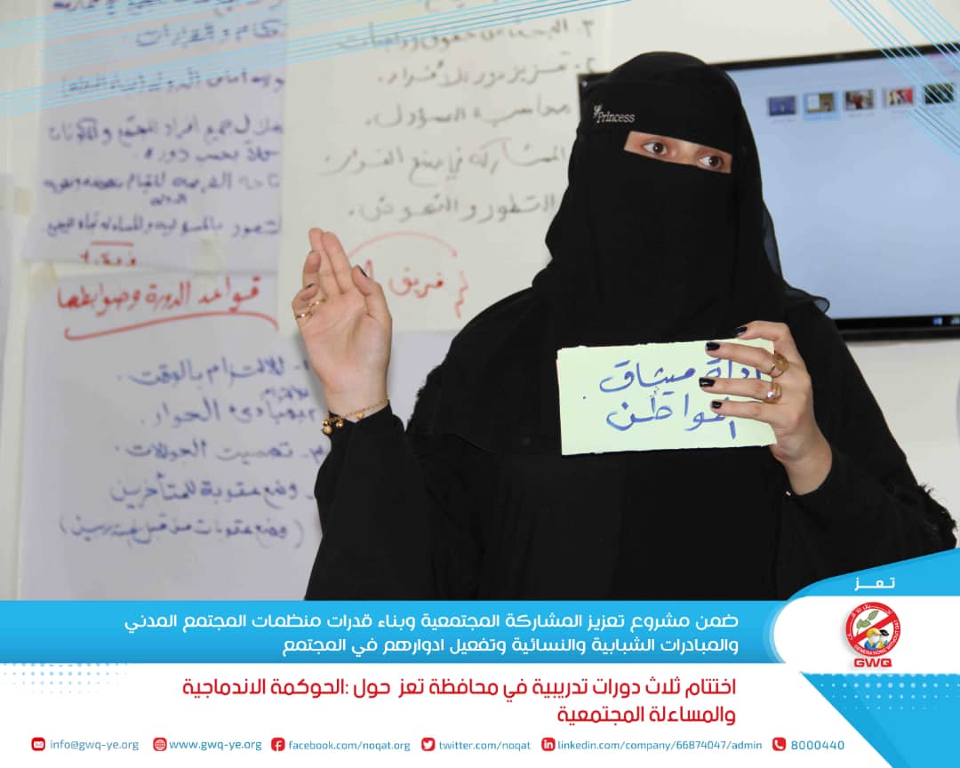 يمن اونلاين -تعزأختتمت منظمة أجيال بلا قات للتوعية والتنمية، اليوم الثلاثاء 22 يونيو 2021، ثلاث دورات تدريبية في محافظة تعز حول "الحوكمة الإندماجية والمساءلة المجتمعية"، وذلك في إطار مشروع "تعزيز المشاركة