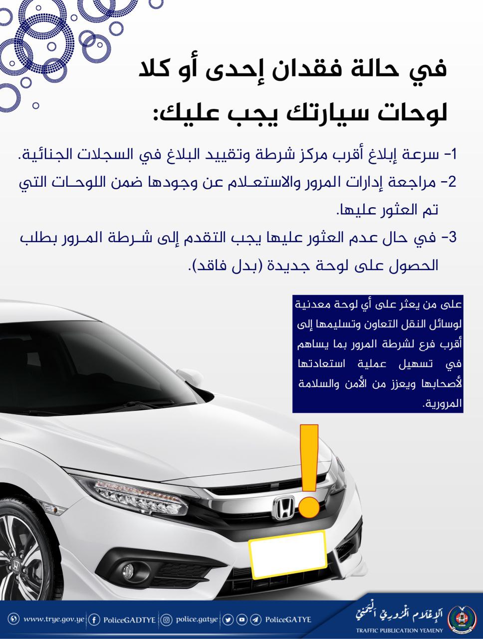 أعلنت شرطة المرور لجميع مالكي وسائل النقل بأنواعها المختلفة في حالة فقدان إحدى لوحات الأرقام المعدنية أو كلى اللوحتين الخاصة بالسيارة، الإسراع في إبلاغ أقرب قسم شرطة بالحالة والواقعة وتقييد البلاغ في السجلات