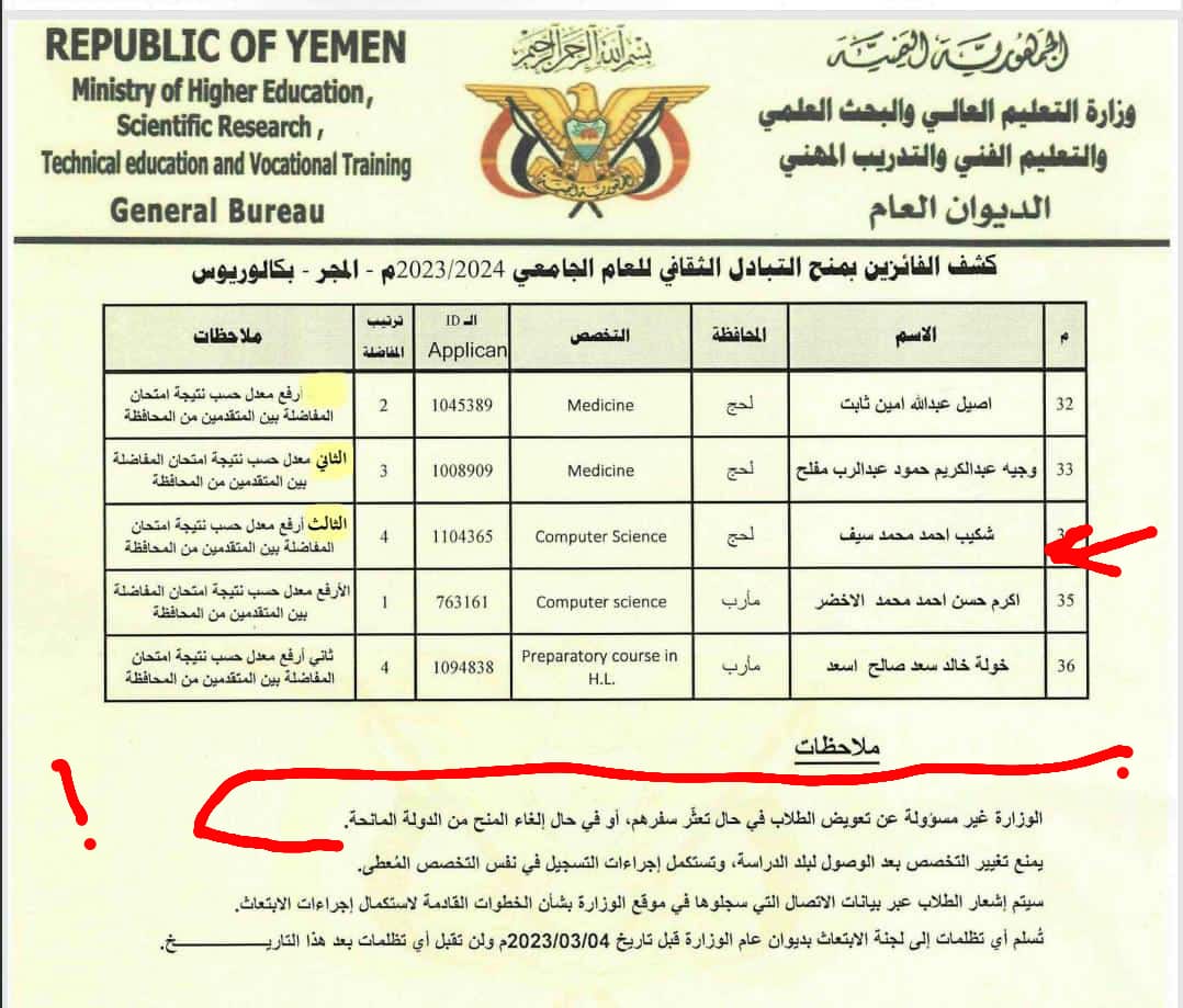 عدن : شكى الطالب شكيب أحمد سيف، من اعتزام وزارة التعليم العالي في عدن، الاستيلاء على منحته التي حصل عليها من المجر، بعد امتحانات قبول، اجتازها بجدارة. وقال الطالب شكيب، "امتحنت المفاضلة وجيت الرابع في المحافظة،