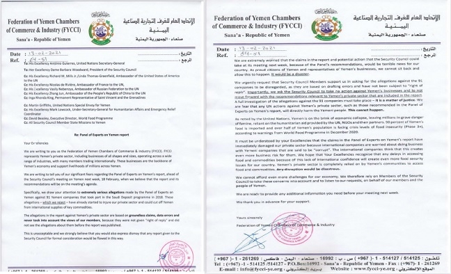 حذر اتحاد الغرف التجارية الصناعية اليمنية في رسالة الى امين عام الامم المتحدة انطونيو غوتيريس واعضاء مجلس الامن، من تداعيات الاخذ بتوصيات خبراء لجنة الخبراء حول الوديعة السعودية.