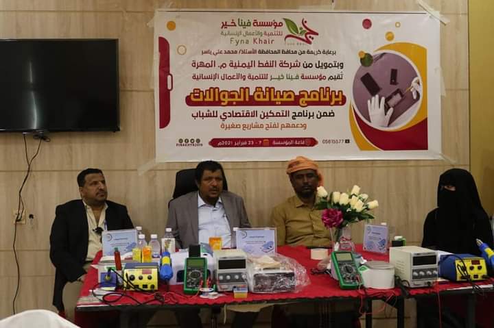 يمن اونلايندشنت مؤسسة فينا خير للتنمية والأعمال الإنسانية ، اليوم، مشروع تمكين الشباب في صيانة الجوالات ل ٢٥ شاب من جميع مديريات محافظة المهرة لمدة ١٥ يوماً ، وذلك بحضور أمين عام المجلس المحلي الأستاذ سالم