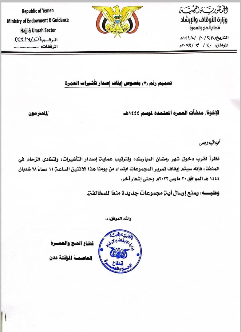 قررت وزارة الأوقاف والإرشاد، إيقاف تأشيرات العمرة، اعتباراً من مساء اليوم الاثنين حتى إشعار آخر، لـ"تفادي الازدحام بمنفذ الوديعة". وفي تعميم وجّهه قطاع الحج والعمرة بالوزارة، اليوم الاثنين، إلى منشآت