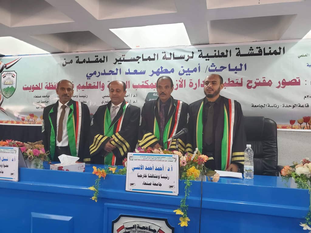 أقيمت صباح يوم هذا الاربعاء الموافق2023/3/22بجامعة إب المناقشة العلنية لرسالة الماجستير المقدمة من الباحث امين مطهر الحدرميوالموسومة بتصور مقترح لتطبيق ادارة الازمات في مكتب التربية والتعليم بمحافظة المحويتوقد