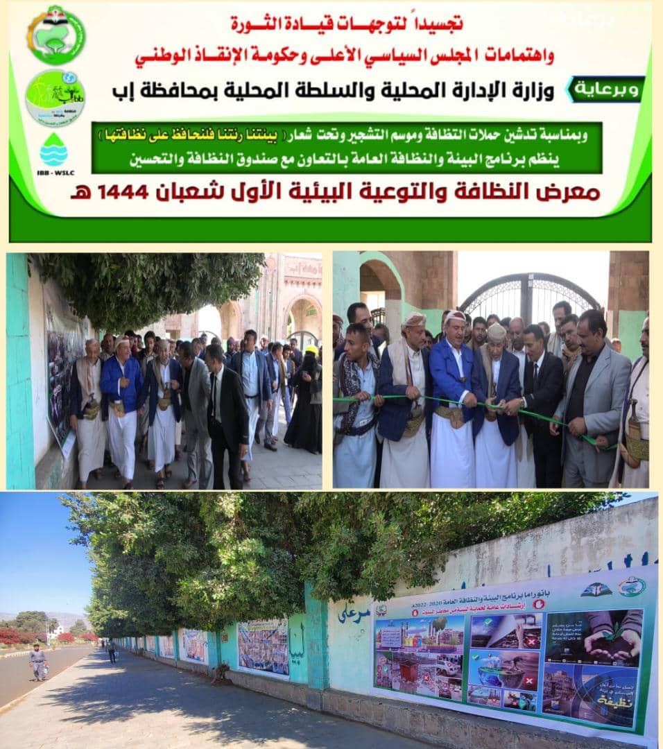 افتتح امين عام المجلس المحلي بمحافظة اب العميد امين علي الورافي ومعه وكيل اول المحافظة الشيخ عبدالحميد الشاهري ومستشار رئيس الوزراء لشؤن البيئة والاعلام علي الاسدي صباح اليوم معرض النظافة والتوعية البيئية الاول