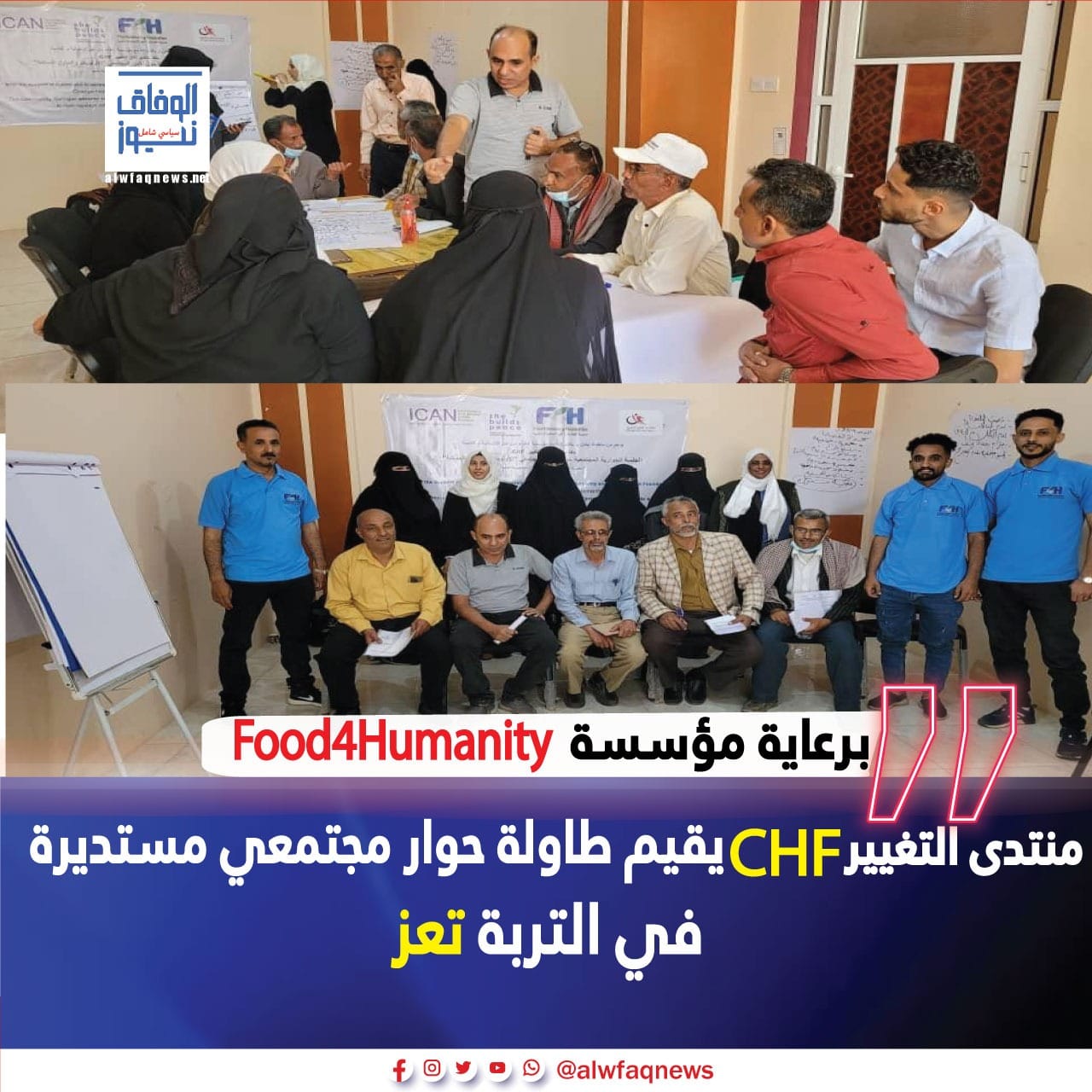 تعز _ خاص: أُقيمت في تعز طاولة مستديرة للحوار المجتمعي الأولويات والحلول الممكنة" ضمن برنامج "الحوار المجتمعي وحل النزاعات " الذي تنفذه مؤسسة الغذاء من اجل الانسانية Food4Humanity بدعم منظمة ايكان، والتي اقامها