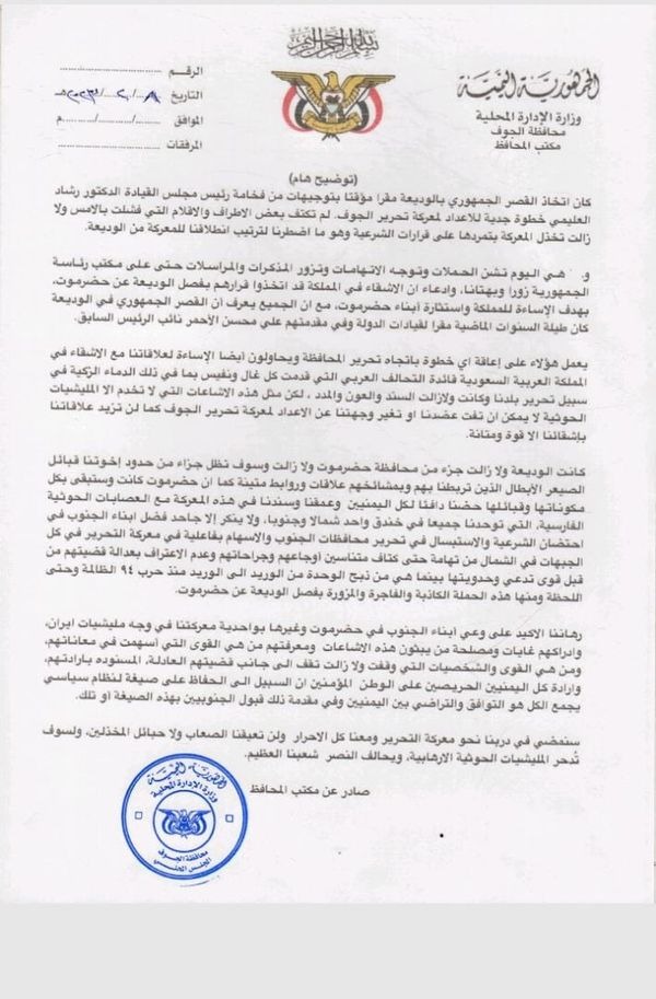 خاصنفى محافظ الجوف اللواء / حسين العجي العواضي صحة المزاعم التي روجت لها وسائل إعلام وناشطين تابعين لجماعة الاخوان بفصل منفذ الوديعة عن محافظة حضرموت وضمه للجوف ، عقب تدشين العواضي لعمله من داخل المنفذ.واصدر مكتب