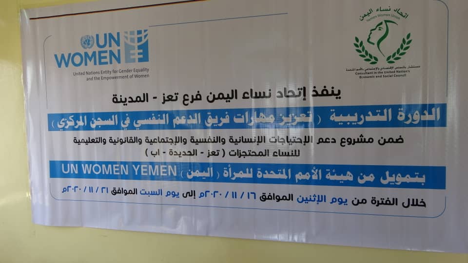 يمن اونلاين - تعز/نعائم خالد اقيمت في محافظة تعز الدورة التدريبيه في مجال تعزيز مهارات فريق الدعم النفسي للنساء المحتجزات في السجن المركزي والتى يقيمها اتحاد نساء اليمن فرع المدينه تعز ضمن مشروع دعم الاحتياجات