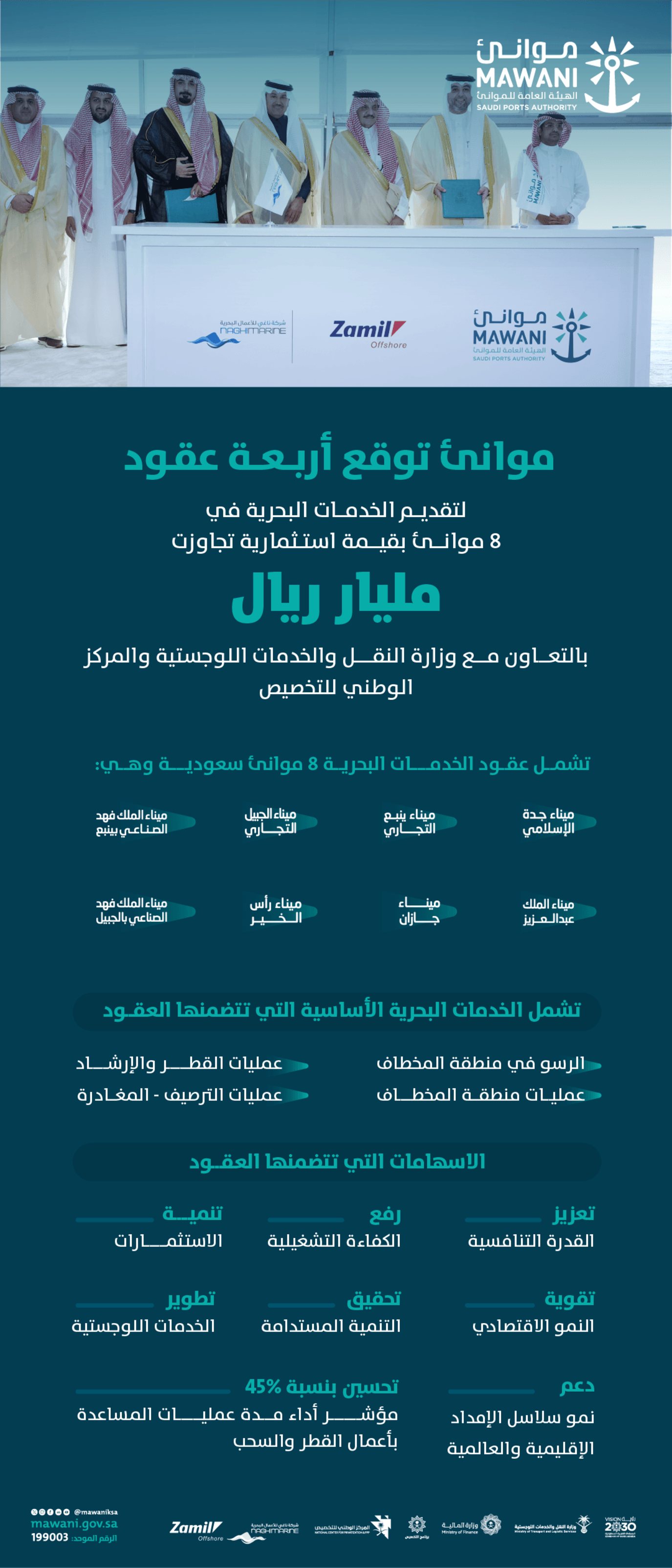 وقعت الهيئة العامة للموانئ "موانئ" 4 عقود لتقديم الخدمات البحرية باستثمارات من قبل القطاع الخاص تتجاوز مليار ريال وذلك تحت رعاية الأمير سعود بن نايف بن عبدالعزيز أمير المنطقة الشرقية بحضور وزير النقل والخدمات