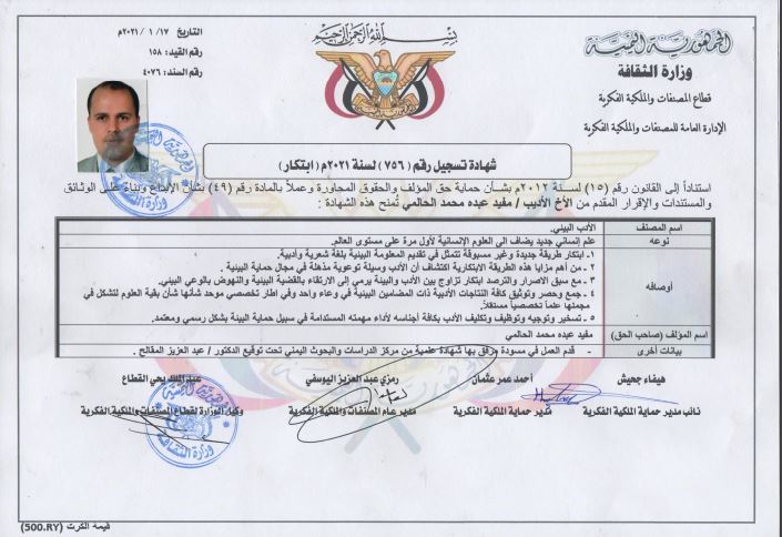 - منحت وزارة الثقافة ممثلة بقطاع المنصفات والملكية الفكرية الأديب اليمني المعروف مفيد الحالمي براءة الإختراع / شهادة إبتكار الخاصة بتأسيسه لعلم جديد هو علم (الأدب البيئي) كعلم إنساني جديد يضاف إلى العلوم الإنسانية لأول مرة على مستوى العالم أجمع .. وذلك في شهادة التسجيل رقم (٧٥٦) لسنة ٢٠٢١م.