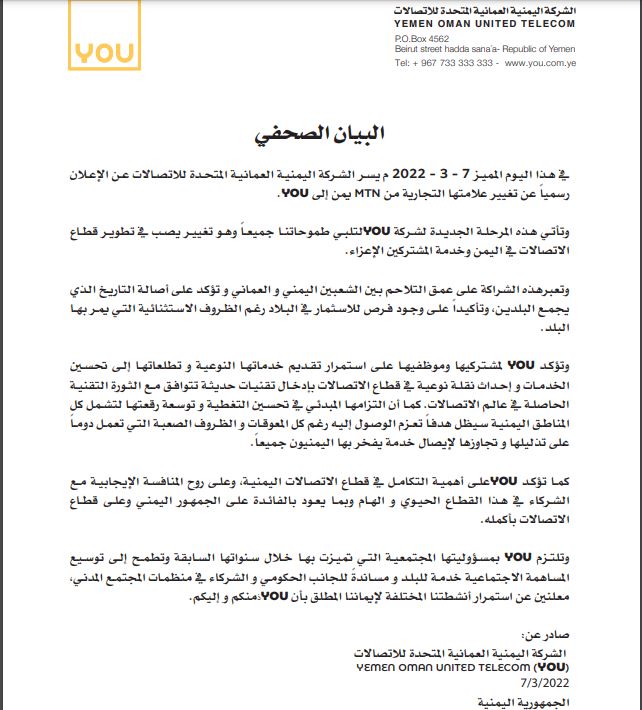 واصدرت الشـركة اليمنيـة العمانيـة المتحـدة للاتصـالات بيانا اعلنت خلاله رسميا تغيير علامتها التجارية من MTN يمن إلى YOU .