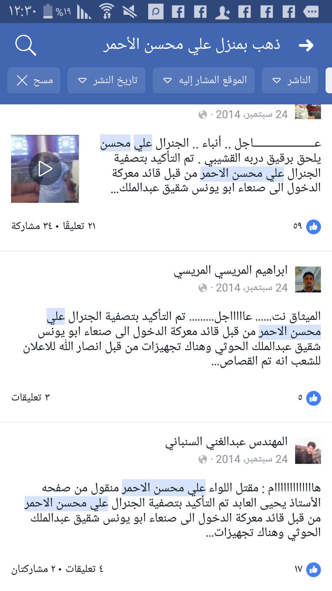في ذكرى النكبة اليمنية وعلى هشتاج #نكبة_21_سبتمبر 2014 م ذكرى الانقلاب أعاد ناشطون موالين للشرعية منشورات المؤامرة على الفرقة الأولى مدرع واستهداف الجنرال علي محسن الأحمر فبعد يومين من الانقلاب خرجت صفحات قيادات وقواعد ونشطاء الحركة الحوثية والموتمر الشعبي العام التابع للمخلوع صالح ونشطاء الحراك الجنوبي الموالي لإيران مبتهجين بشائعات استهدفت الفريق علي محسن بشكل يوضح مدى حقدهم عليه وكيف كان الجنرال محسن هو السور الواقي للدولة والجمهورية وبعد مغادرته تهاوت مؤسسات الدولة بيد الانقلابيين يومها نشرت شائعة مقتل الجنرال علي محسن الأحمر وابتهجوا فرحين مع أكذوبة العثور على سبائك ذهب في منزل علي محسن الأحمر وسلسلة من الفبركات والأكاذيب اتضح زيفها..!