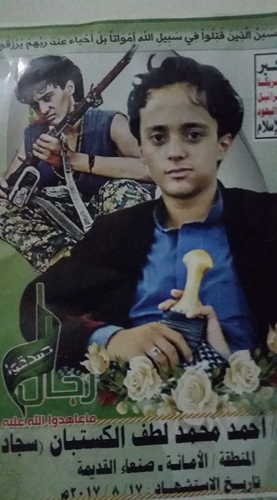 و علی غير العادة لم تتضمن ملصقات الحوثيين التي تحمل صورته إشارة لموقع استشهاده وفي أي جبهة بهدف إخفاء حقيقة أن طفل لا يتجاوز عمرة 15 عاما تم الدفع به بلا رحمه لتنفيذ عملية انتحارية في مسرح عمليات عسكري. مكشوف ومرصود من قبل القناصة السعوديين وطائرات الاباتشي فيو و سابقة في تاريخ الحروب لا تقترفه حتى العصابات .