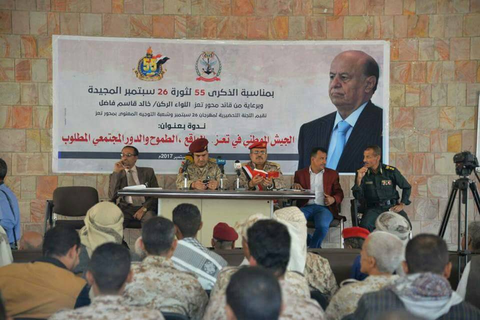 أقامت اللجنة التحضيرية لمهرجان 26 سبتمبر وشعبة التوجية المعنوي بمحور تعز،اليوم الأحد، ندوة بعنوان "الجيش الوطني في تعز،الواقع والطموح والدور المجتمعي".
