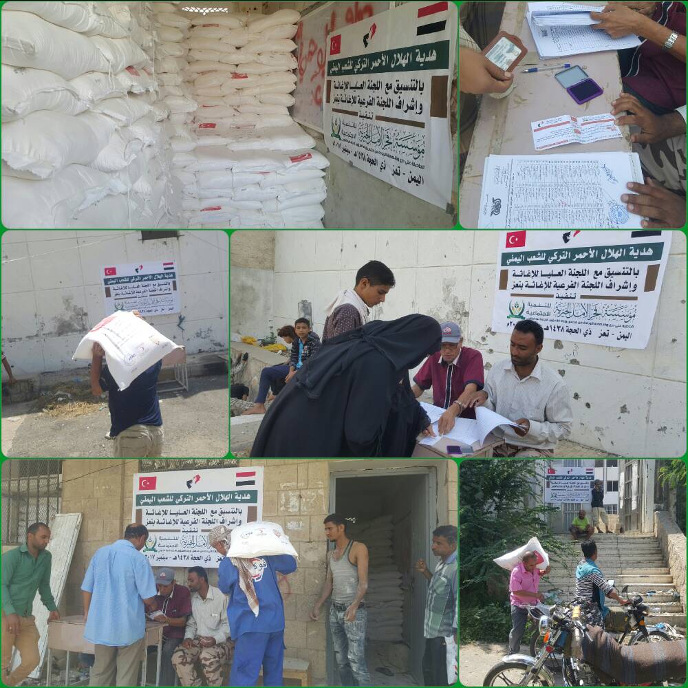 دشنت مؤسسة فجر الأمل الخيرية للتنمية الإجتماعية وبتمويل الهلال الأحمرالتركي وتنسيق ومتابعة اللجنة العليا للإغاثة وإشراف اللجنة الفرعية للإغاثة بتعز وبتعاون السلطة المحلية بمديرية القاهرة توزيع الدقيق التركي على موظفي مديرية القاهرة في مدنية تعز.