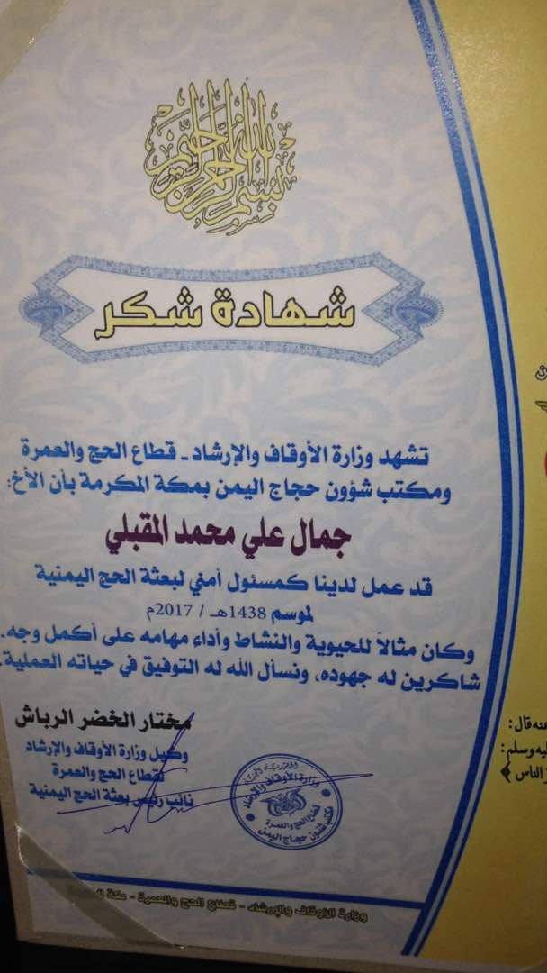 وأضافت المصادر ل"يمن سكاي "ان الرباش قام بمنح عدد كبير من الجنوبيين الذين يشتمون الشرعية ليل نهار تأشيرات حج مجانية وقام باستدعاء المدعو جمال علي محمد المقبلي المحسوب على شلال شايع وعيدرس الزبيدي المتمرد على الشرعيةوكان يريد يفرضة بقوة على البعثة كمسؤول أمني للبعثة ورفض الوزير وتم تعين احد الضباط التابعين للحرس الرئاسي وتفاجاء الجميع بصورة لدرع تكريم لجمال المقبلي الذي استدعاة وحصل "يمن سكاي"علي صورة من الشهادة " ورفض الوزير حينها ان يكون المسؤول الامني للبعثة وتوقيع الشهادة بتوقيع الوكيل بدون الرجوع إلى الوزير او ادارة الشؤون الإدارية وهذه مخالفة لكل اللوائح التى اصلا لا يعرفها فهو كان إمام مسجد لا يعرف من شؤون الدولة والسياسة شي حسب تلك المصادر لكنها الفوضى والعشوائية التى جعلت من الرباش وامثاله وكلاء وزارات.