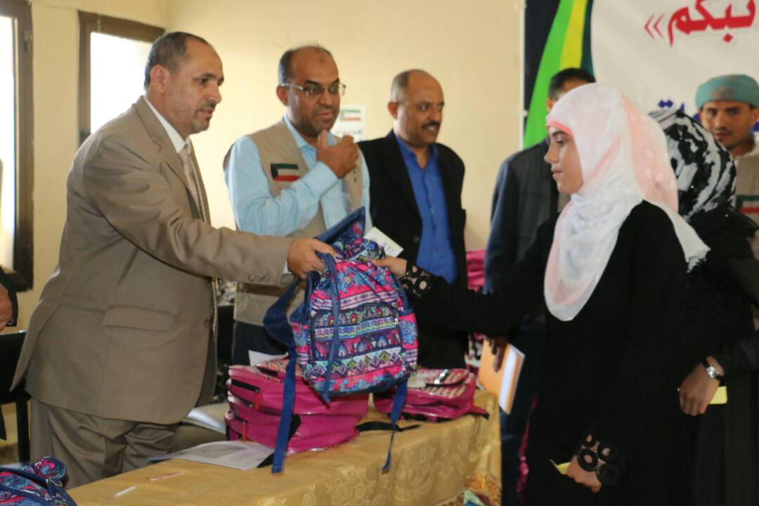 دشنت الهيئة اليمنية الكويتية للاغاثة وسط مدينة تعز ، مشروع توزيع الحقيبة المدرسية للعام الدراسي 2018-2017م ضمن حملة "الكويت إلى جانبكم".برعاية مكتب التربية والتعليم في المحافظة