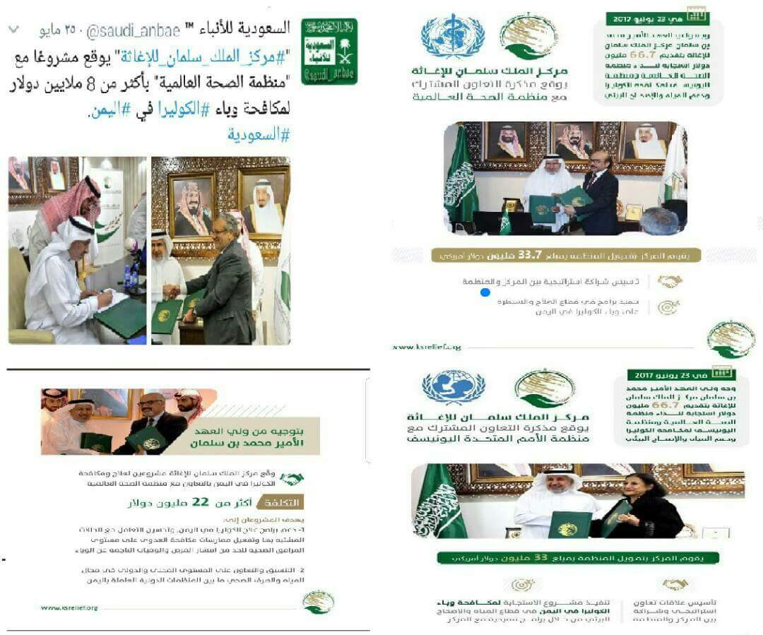 يذكر ان مركز الملك سلمان سبق وان وقع ثلاث اتفاقيات لمكافحة الكوليرا في اليمن مع منظمة الصحة العالمية ومنظمة اليونسف في وقت سابق حيث بلغ اجمالي مبلغ الاتفاقية الاولى والثانية الموقعة مع منظمة الصحة العالمية 41.7 مليون دولار
