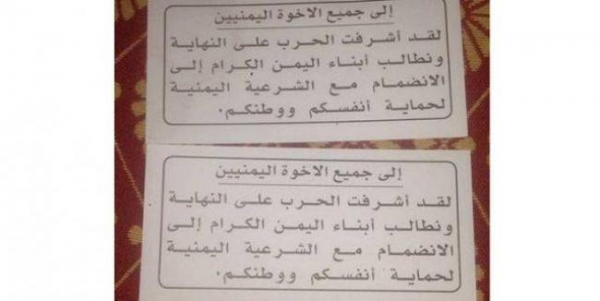 وأكد التحالف العربي من خلال المنشور ات التي سقطت على العاصمة صنعاء الي ان الحرب قد شارفت على الانتهاء منوها انه لا سبيل الي الخلاص من الوضع الحالي الا بالانضمام وتأييد الشرعية اليمنية التي جاء التحالف لنصرتها.