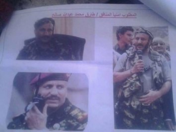 وفي الصور التي نشرها عناصر الحوثي في صنعاء كتب عليها " المطلوب امنيا المنافق/ طارق محمد عبدالله صالح. وكان العميد طارق يقود قوات الحماية الخاصة بعمه علي عبدالله واختفى بعد مقتل الاخير على يد الحوثيين.