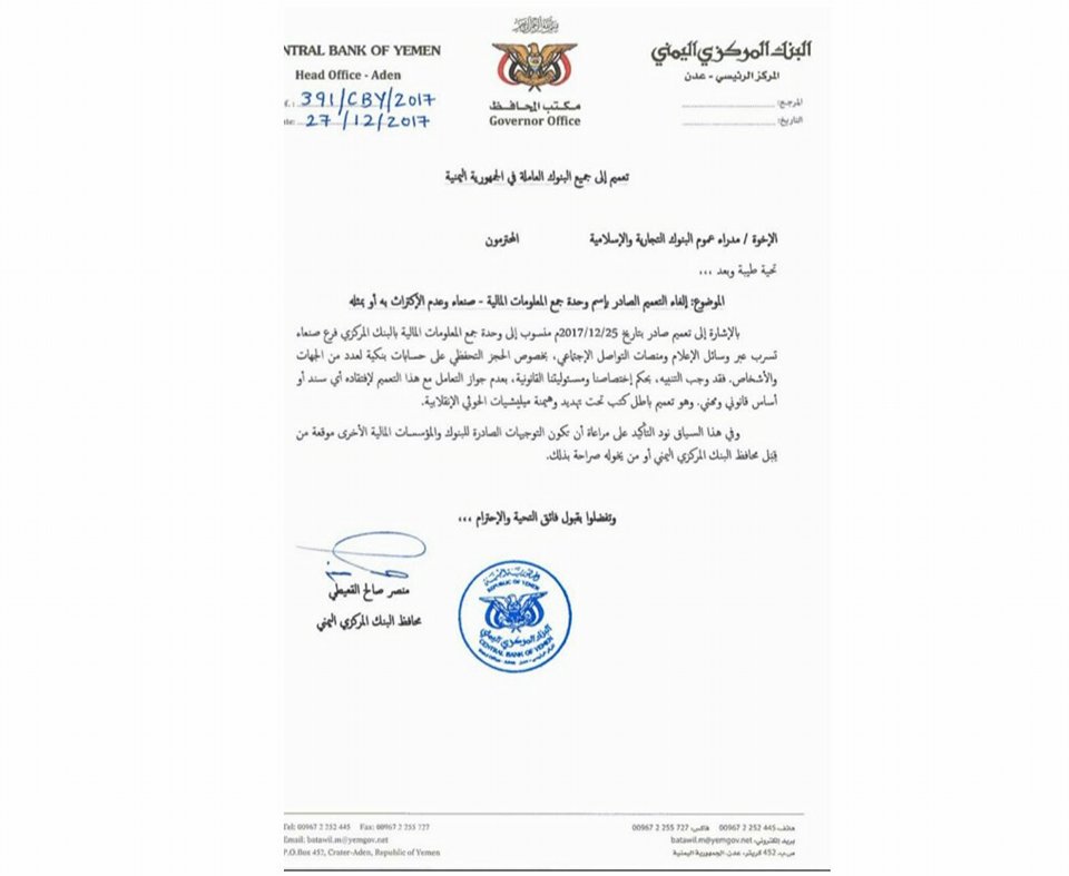 وشدد التوجيه على أن تكون التوجيهات الصادرة للبنوك والمؤسسات المالية الأخرى موقعة من قِبل المحافظ القعيطي أو من يمثله بذلك صراحة. وأشار إلى أن توجيهات البنك المركزي في صنعاء، والخاضع لسيطرة جماعة الحوثيين يفتقد لأي سند قانوني ومهني، وهو تعميم باطل.