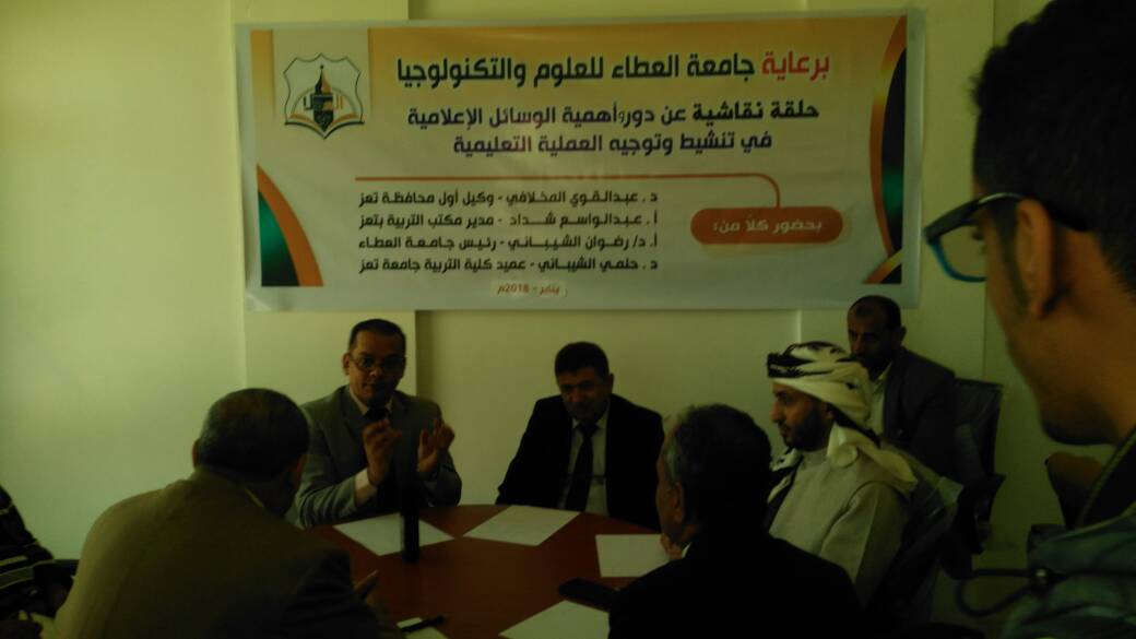 انطلقت صباح اليوم حلقه نقاشيه حول دور اهمية الوسائل الاعلاميه في تنشيط وتوجيه العمليه التعليميه. وتطرقت الحلقه النقاشيه التي نظمتها جامعة العطاء للعلوم والتكنولوجيا على أهمية الاعلام كعنصر فعال وقادرعلى توجيه العمليه التعليميه ونشرالوعي المجتمعي وترسيخ كل القيم والمبادئ الساميه التي تساعد في رفعة المجتمع وتطوره الى الامام. وتزويد افراد المجتمع بالمعلومه الصحيحه حول التعليم واهميته. وتمحورت الورشة حول وسائل الاعلام و الاهتمام بقضايا التعليم التي تخص الشباب والتركيز على أن تتم العملية التعليمية على أساس العقل والمنهج العلمي وليس على أساس الحشو والتلقين. شارك في الحلقة النقاشيه د. عبد القوي وكيل اول محافظة تعز أ.عبدالواسع شداد مديرمكتب التربيه في تعز أ.د. رضوان الشيباني رئيس جامعة العطاء د.حلمي الشيباني عميدكلية التربيه جامعة تعز