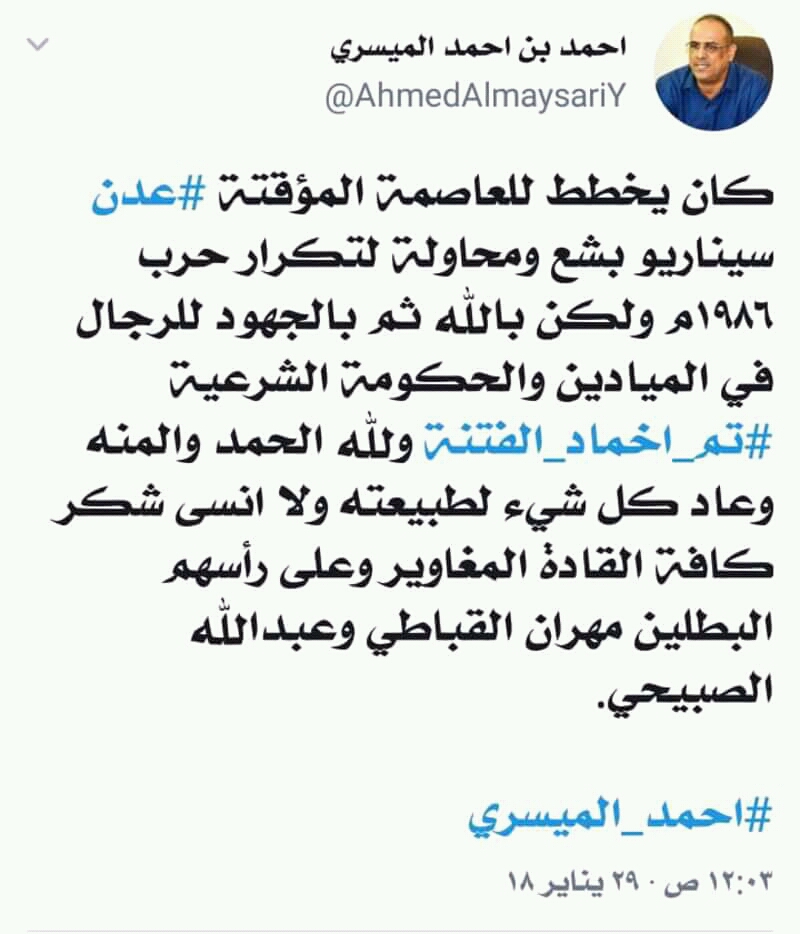 عاجل : وزير الداخلية يعلن اخماد الفتنة في عدن