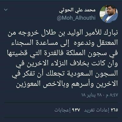 وجه محمد علي الحوثي رئيس مايسمى باللجنة الثورية الحوثية رسالة للامير السعودي الوليد بن طلال هنأه بمناسبة خروجه من المعتقل ودعاة الى مساعدة السجناء في،سجون المملكة حسب قولة.