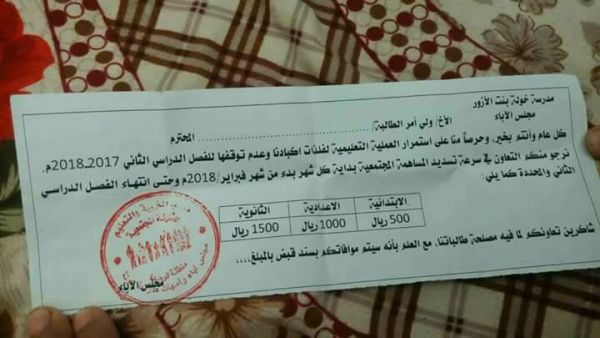 طالبت مليشيات الحوثي الانقلابية، من أولياء أمور الطلاب في مناطق سيطرتها بدفع مبالغ مالية شهرية من أجل استمرار العملية التعليمية خلال الفصل الدراسي الثاني 2017/2018م.